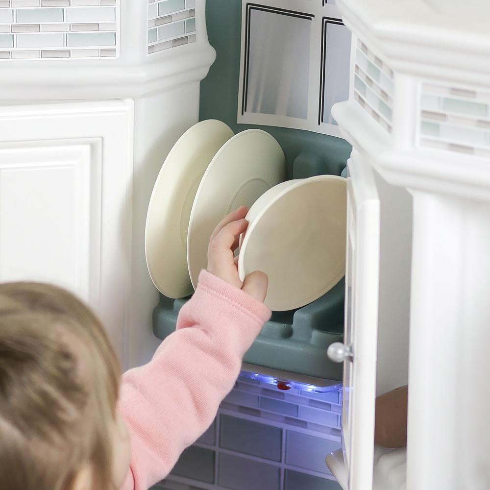 • Ventana enmarcada con luz superior que funciona y repisa para platos alentará a los niños a pretender que lavan los platos y comida de juguete