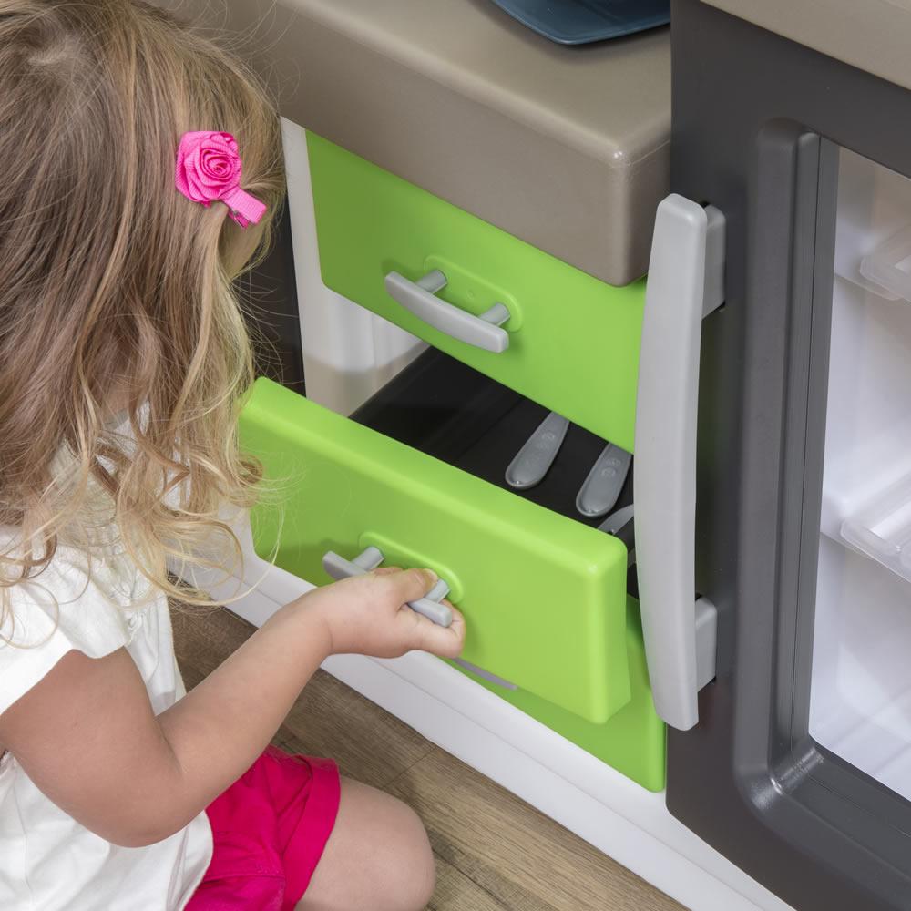 - ¡Cuando termina el tiempo de juego, los más pequeños pueden poner sus elementos esenciales de cocina en los estantes moldeados, armarios o colgar sus utensilios!