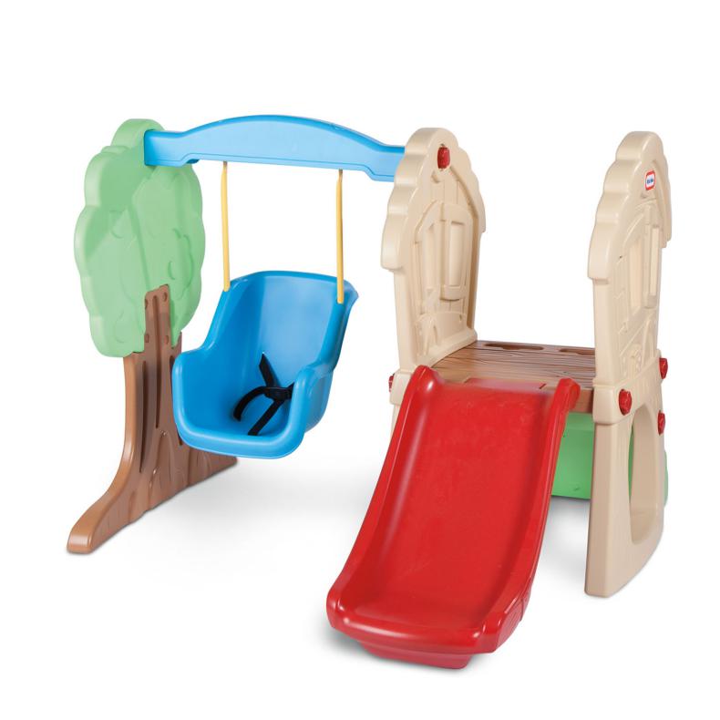 Este columpio ofrece múltiples opciones de juego; un tobogán, un columpio, una pared de roca y una plataforma les da a los niños mucho que hacer.